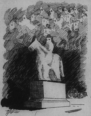 Old men rise from their sleep in comfortable homes, from soldiers’ refuges and from hospital beds, and in their dreams ride out to meet him again. To watch the park would disappoint you, for what mortal eye may see the soldier-spirit that comes again to its own? You would see only mist-wreathe blowing hither and yon from shadow to shadow, where a file of ghostly men of the Ku-Klux-Klan performed again their intricate evolutions: you would hear only a sigh of the wind where the stern warriors repeated in concert the great, binding oath of the order you would hear only the scamper of tiny animal feet or the sleepy call of a night-bird where the men called together of deeds to be done or wrongs to be avenged: you would hear only the faint rumble of thunder where the great company of horses trampled with pad-softened hoofs across time-hardened turf and granolith walk. A phantasy of the brain you will say, for only to those who know will the sprctral throng and its meaning be known. Only to those can the mysteries of the night be interpreted, for by day one sees only a stalwart figure in bronze and stone draped still in its sculptor’s canvas waiting for the cord to be drawn that will reveal a fitting memorial to a man who served his country with honor and distinction and with his sword carved his name on the walls of the temple of fame in those days of long ago “when knighthood was in flower."                                           A. B.